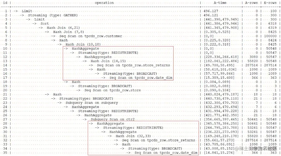 本节,我们用tpcds中的Q1作为示例,未使用hint前的查询及计划如下: