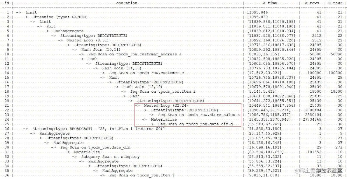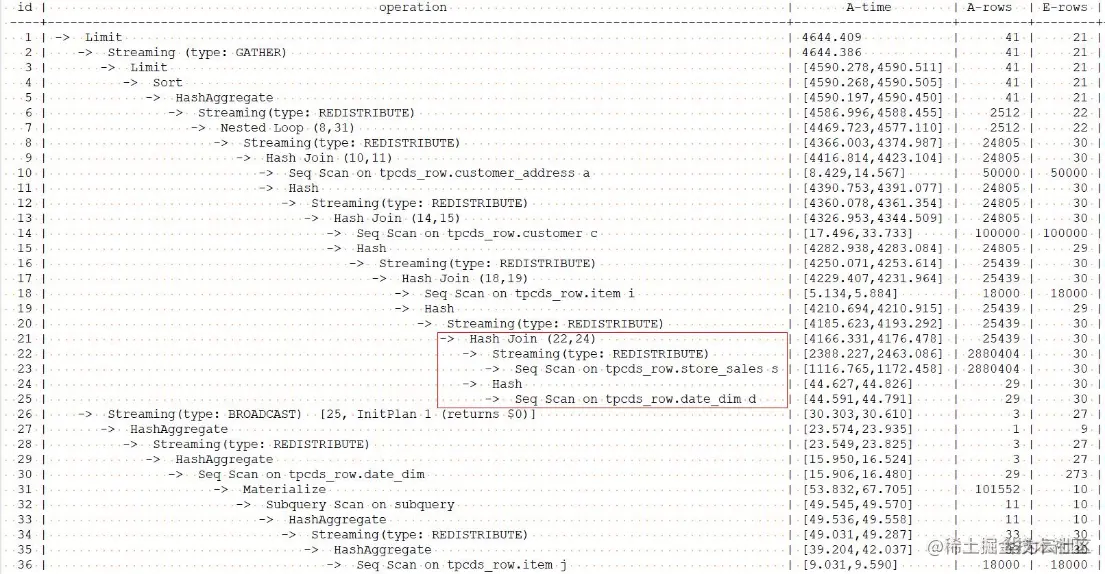 由于store_sales表没有统计信息,所以在上面的各个计划中可以看到,store_sales表的估计行数和实际行数相差非常大,这就会导致生成了最初的效率比较低的计划。下面我们看看使用行数hint的效果。
