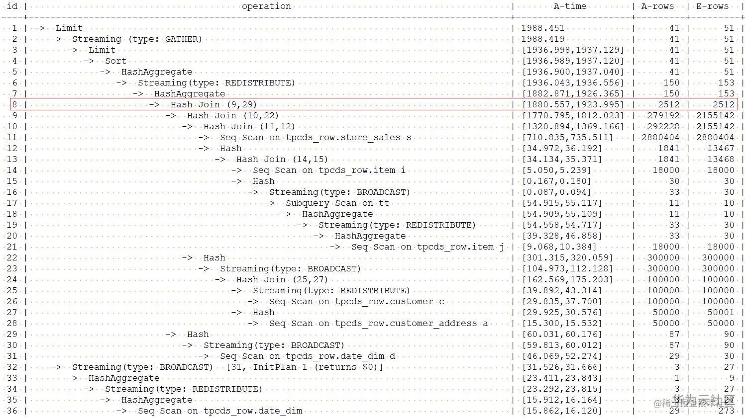 8号算子的估计行数已经和实际行数一致。由于8号算子不是计划的瓶颈点,所以性能提升并不明显。