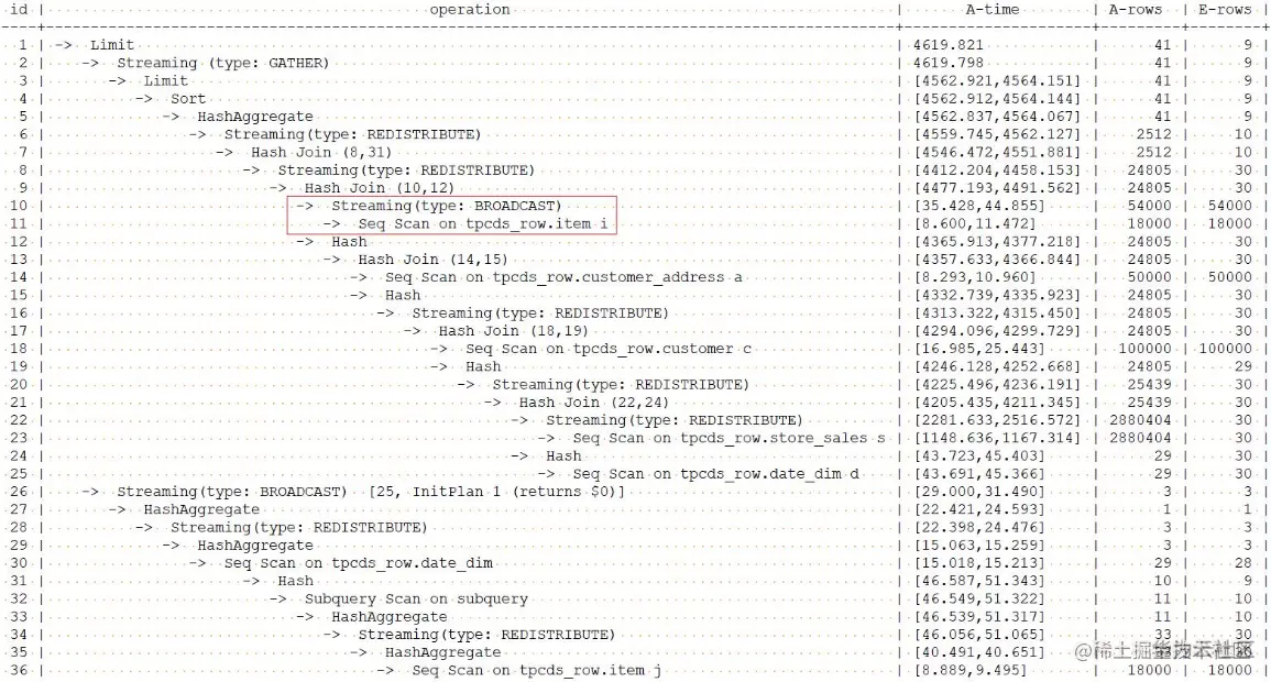 可以看出,之前在item扫描后的结果上是redistribute分布方式,现在已经变为了broadcast分布方式。Broadcast分布方式一般用于数据量比较小的结果集上,相反redistribute用于数据量比较大的结果集上。所以,根据执行计划中单表或表join后的结果集大小,可以通过这种方式,调整结果集的分布方式,从而提升查询的性能。