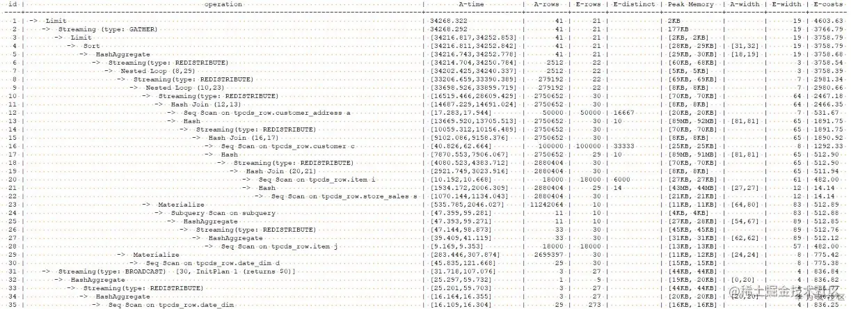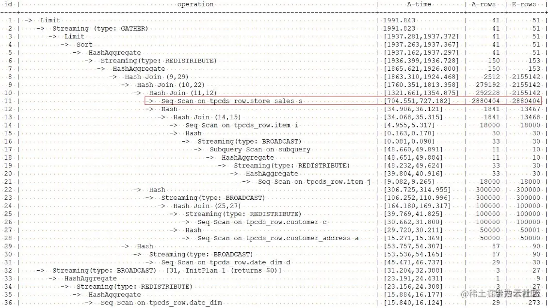 指定了store_sales表的准确行数后,优化器生成的计划执行时间直接从最初的34268.322ms将为1991.843ms,提升了17倍。这也充分的说明了优化器对统计信息准确性的强烈依赖。