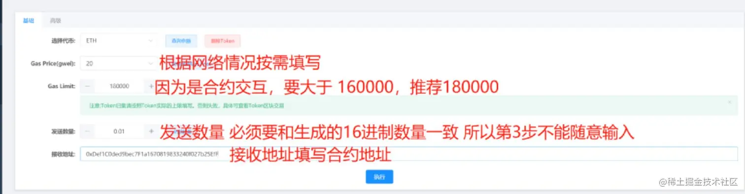 重要:发送数量要和第4步一致!!接收地址是第4步复制的合约地址。 其他按照图片的填写即可,千万不要乱改噢。(万恶的区块链不可逆)