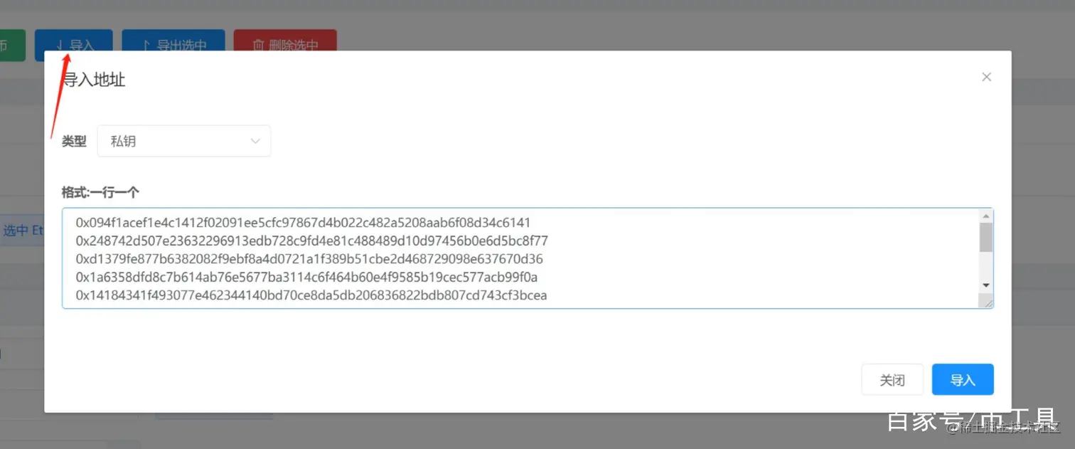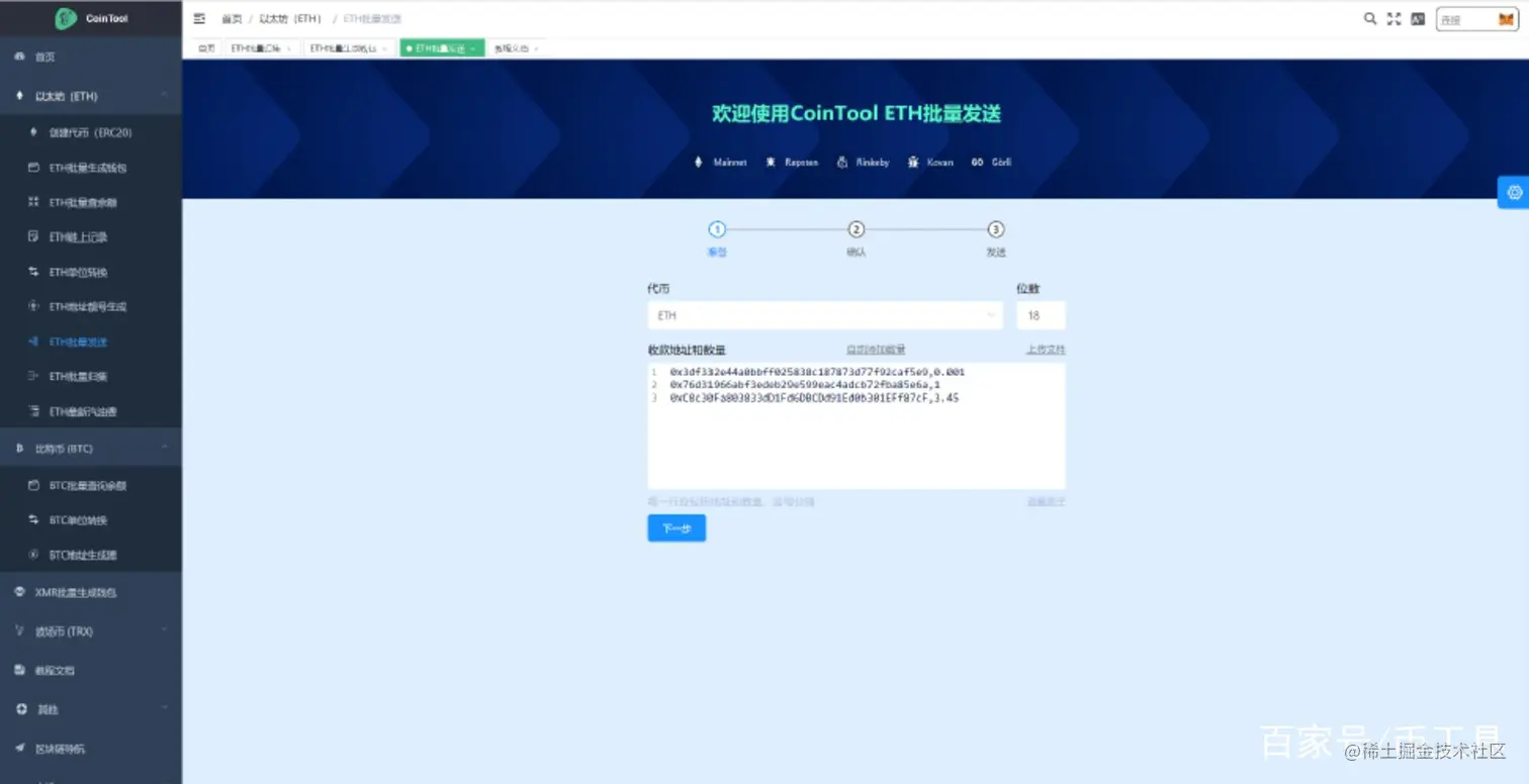 打开 cointool.catxs.com/eth/ethMore… ETH批量归集工具,导入我们前面生成地址的私钥