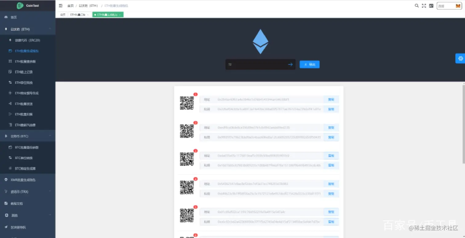 1.打开 cointool.catxs.com/eth/createW… 批量创建ETH地址工具。我们这里生成10个地址。