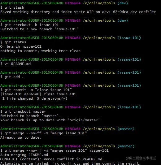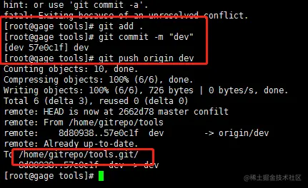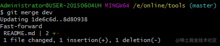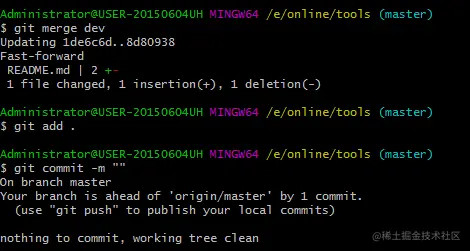 git merge dev 不需要进行git add 等操作,它自动完成了