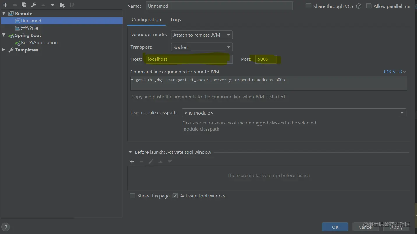 - 获取远程项目的 IP和端口 (确保远程服务是开启debug模式的,如果是springboot通过jar或者war方式打包的,可通过 java -jar -Xdebug -Xrunjdwp:transport=dt_socket,server=y,suspend=n,address=8081 my-project.jar 命令设置对外访问端口和debug模式启动)