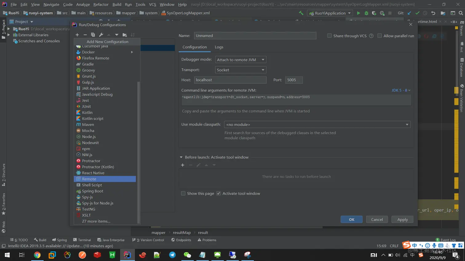 - 在+ 号打开页面中选择Remote ,在打开的页面中配置IP 和 端口 ,然后确定