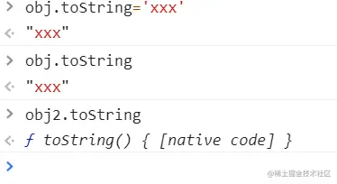 上述代码中,obj和obj2都含共有属性toString,obj.toString='xxx'只会修改自身属性,从而不会影响obj2的toString,obj2的toString还在原型上。