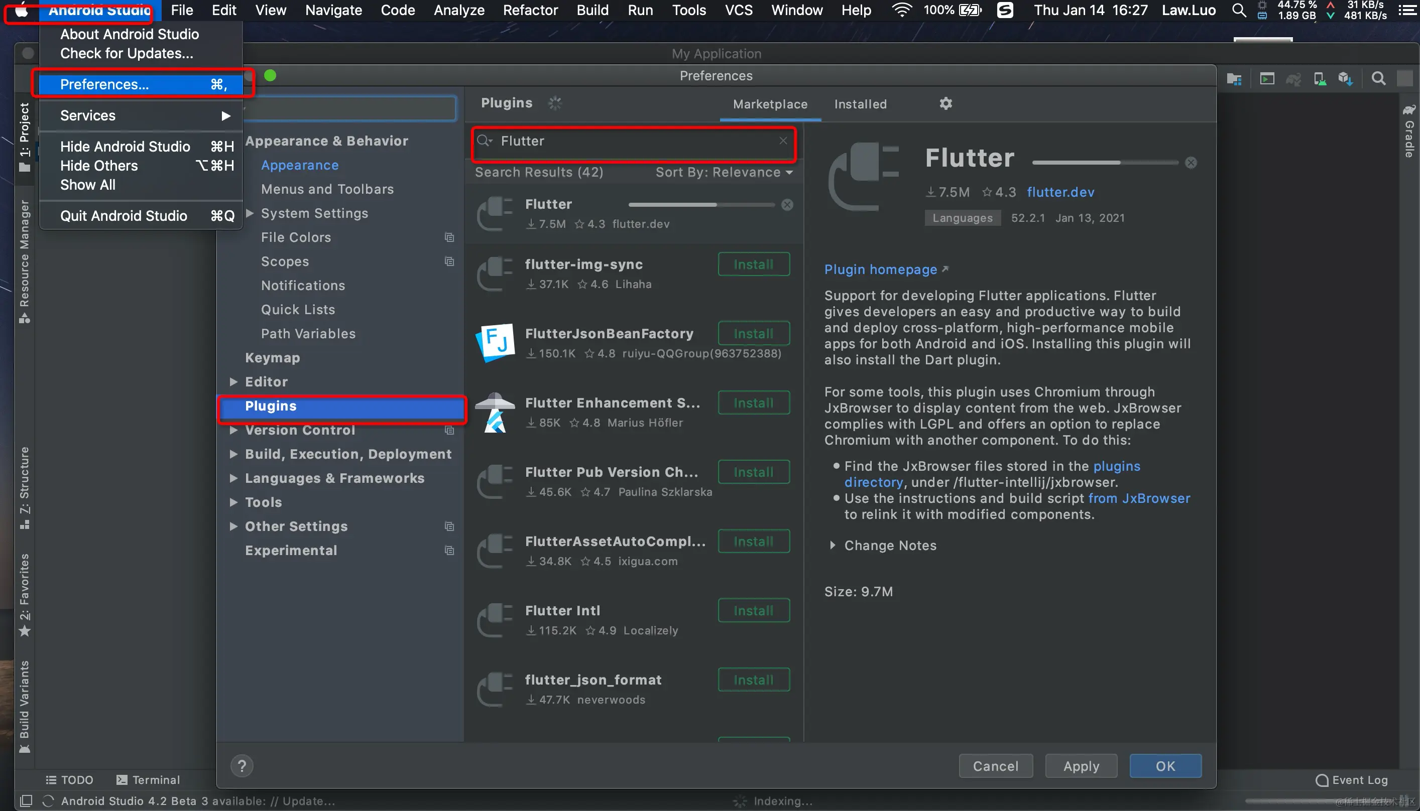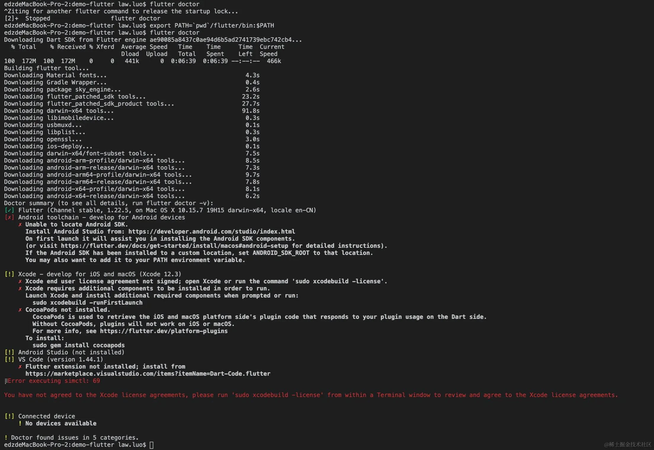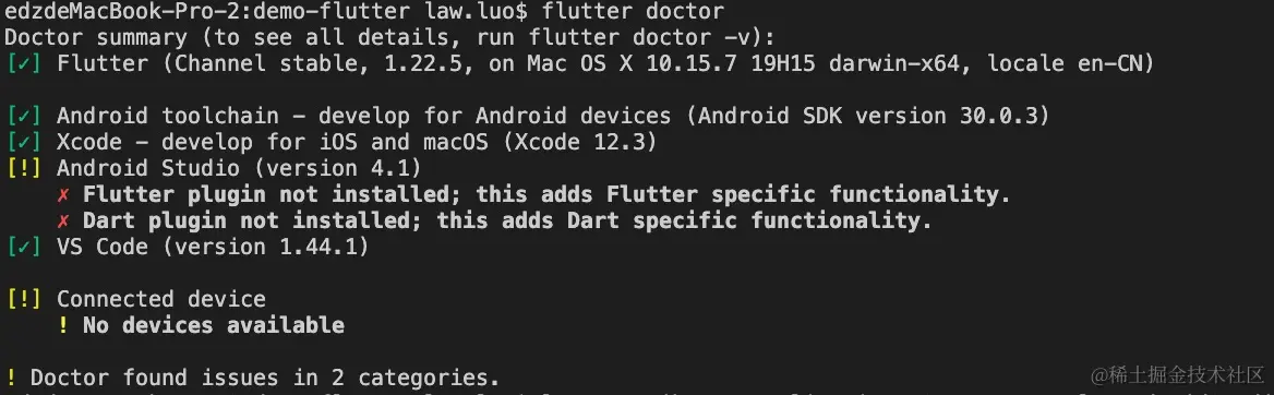 如果:MAC, Android Studio 4.1环境, 安装flutter插件并重启后在终端运行flutter doctor却报错,具体如下