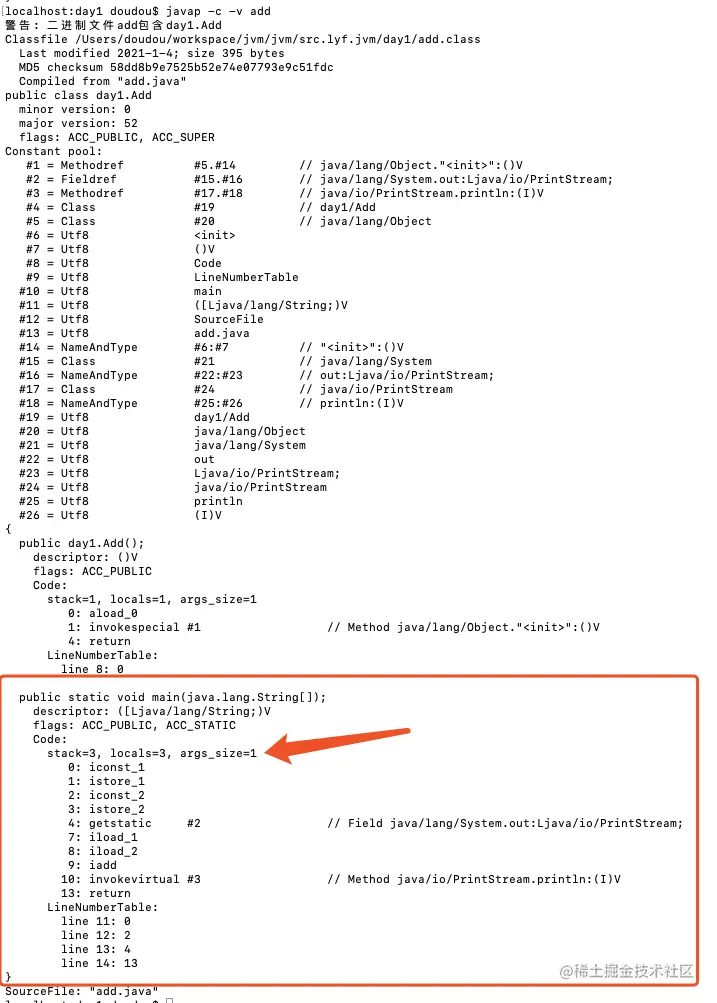 3.局部变量表所需的内存空间在编译期间完成分配,当进入一个方法时,这个方法需要在栈帧中分配多大的局部变量空间是完全确定的,也就是局部变量槽的数量是确定的。为了加深这一点的印象,我们通过javap -c -v add来查看下add.java的字节码文件。