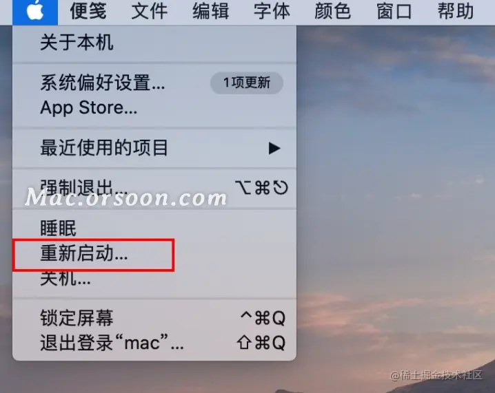 然后,再次回到下拉菜单栏,点击【重新启动】,应该就可以关机了。