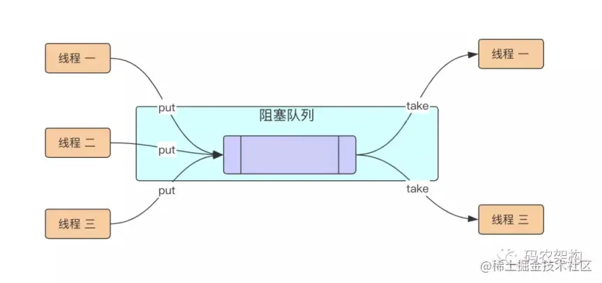 下图是阻塞队列工作示意图,线程一、线程二、线程三生产的数据通过put操作进行入队,线程四、线程五通过take操作进行出队,当队列满时put操作会阻塞等待消费者将队列的元素拿走,当队列为空时take操作会阻塞等待生产者将数据入队。