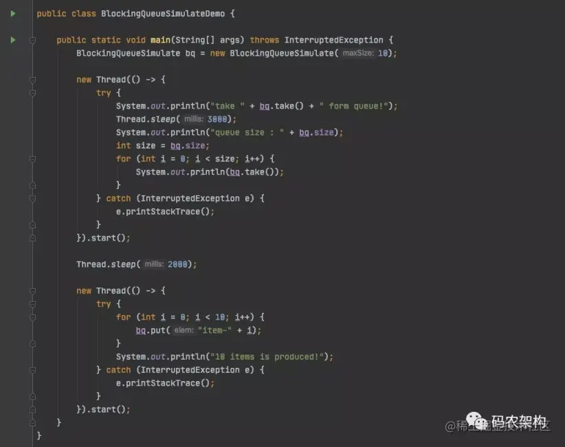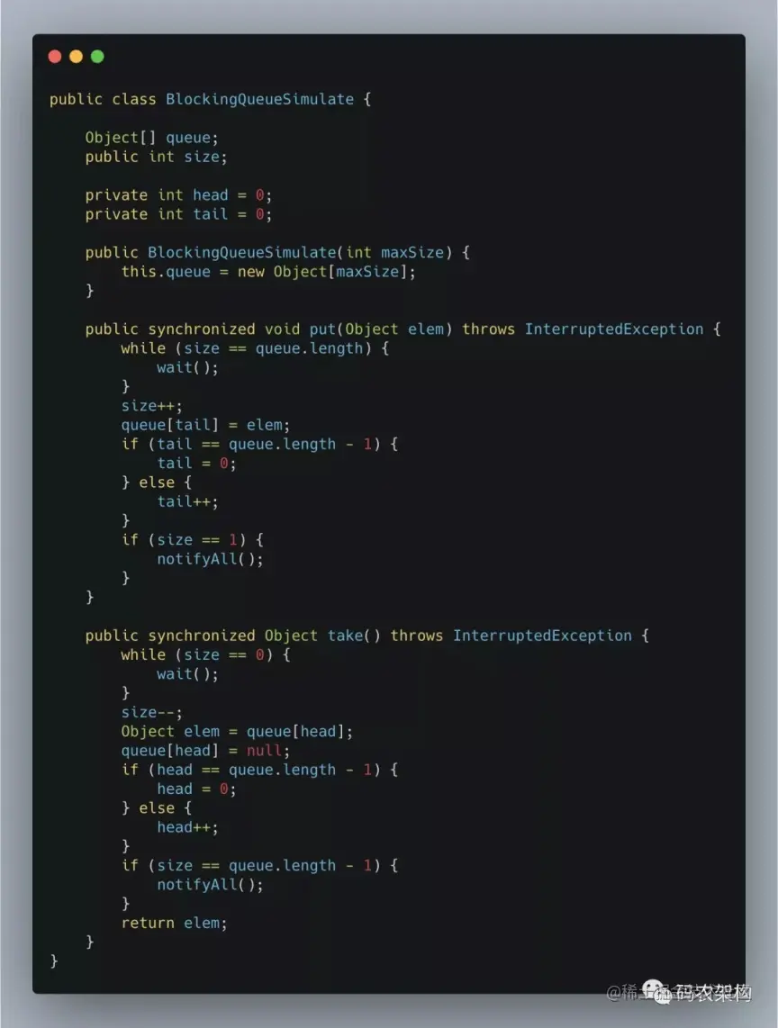 下面看看具体的实现,Object数组用于保存元素,size表示队列的大小,此外还有head和tail指针。通过构造函数来指定阻塞队列大小,生产者生产的数据调put方法进行入队,如果size等于队列最大长度时则调用wait阻塞(此时队列已经满了),否则将元素保存到队列中,同时维护size和tail,最后如果size等于1时要调用notifyAll方法通知消费者可以消费了。消费者通过调用take方法进行数据消费,如果size等于0时则调用wait阻塞(队列为空需要等待),否则通过head获取队列头的元素,同时维护size和head,最后如果size等于queue.length-1时调用notifyAll方法通知生产者可以生产了。
