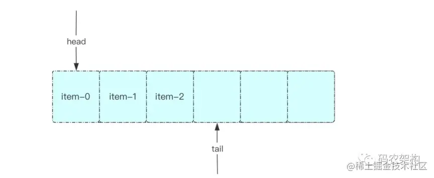 根据前面对阻塞队列的介绍,我们试着来模拟实现一个简单的阻塞队列。先看数据结构的设计,可以使用一个数组来存放队列的元素,并通过head和tail指针来约束先进先出规则。入队操作使用tail指向的位置,而出队则使用head指向的位置,一旦到达数组尾部就重新从头开始。