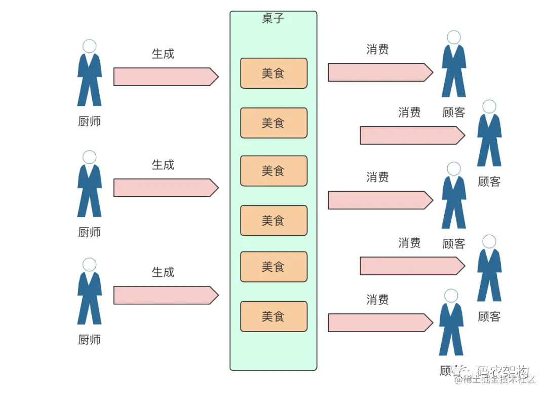 我们可以通过厨师、桌子、顾客来说明生产者消费者模式,厨师就好比生产者,他们制作生产出来美食将放到桌子这个容器中,顾客则好比是消费者,他们从桌子上取出美食进行消费享用。