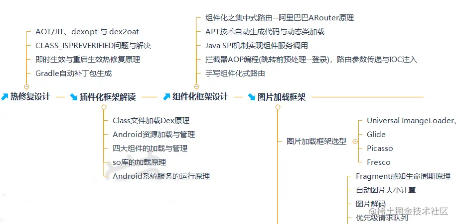 1、热修复设计 2、插件化框架解读 3、组件化框架设计 4、图片加载框架 5、网络访问框架设计 6、RXJava响应式编程框架设计 7、IOC架构设计 8、Android架构组件Jetpack