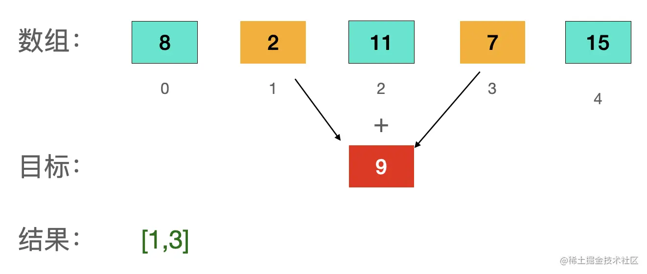 在本题中,就可以拿空间换时间,先创建一个哈希表,对于每一个 x,首先查询哈希表中是否存在 target - x,如果不存在则将 x 插入到哈希表中,如果存在则返回 key 对应的坐标和当前元素的坐标。