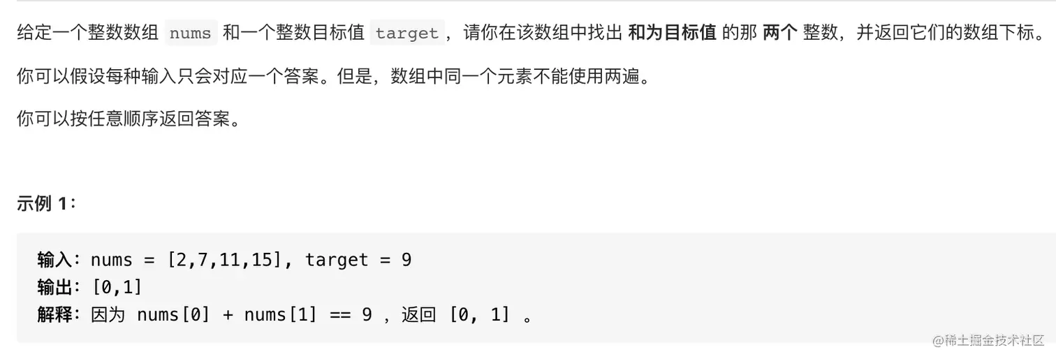 题名称为 “两数之和”,题目详情如下,对应官方链接:leetcode-cn.com/problems/tw…