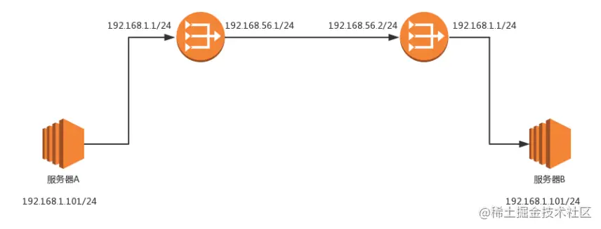 在路由器 A 中配置了静态路由:要想访问 192.168.56.2/24,要从 192.168.56.1 这个口出去,没有下一跳了,因为我右手这个网卡,就是这个网段的,我是最后一跳了。