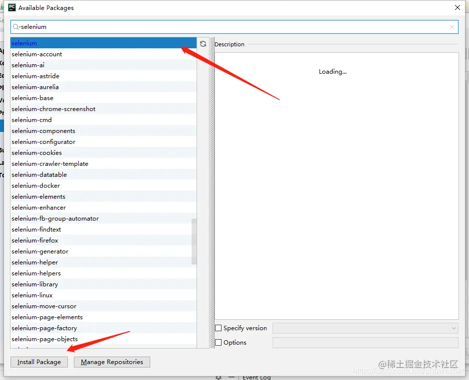 直接搜索selenium,选择selenium,点击Install Package,等selenium安装好就可以使用selenium了。