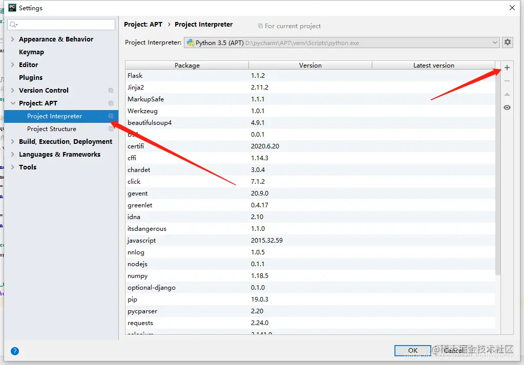在Settings中点击Project Interpreter,点击加号就可以安装各种需要的扩展包