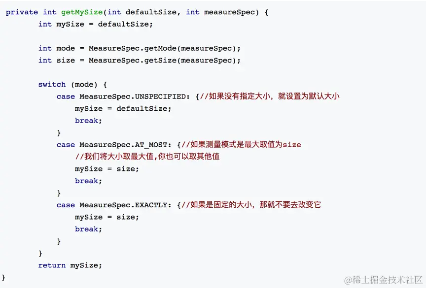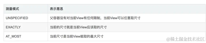 wrap_content—>AT_MOST。怎么理解:就是我们想要将大小设置为包裹我们的view内容,那么尺寸大小就是父View给我们作为参考的尺寸,只要不超过这个尺寸就可以啦,具体尺寸就根据我们的需求去设定。