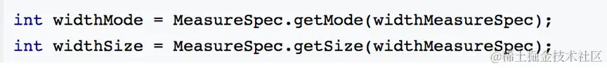 onMeasure函数是一个int整数,里面放了测量模式和尺寸大小。int型数据占用32个bit,而google实现的是,将int数据的前面2个bit用于区分不同的布局模式,后面30个bit存放的是尺寸的数据。 onMeasure函数的使用如下图: