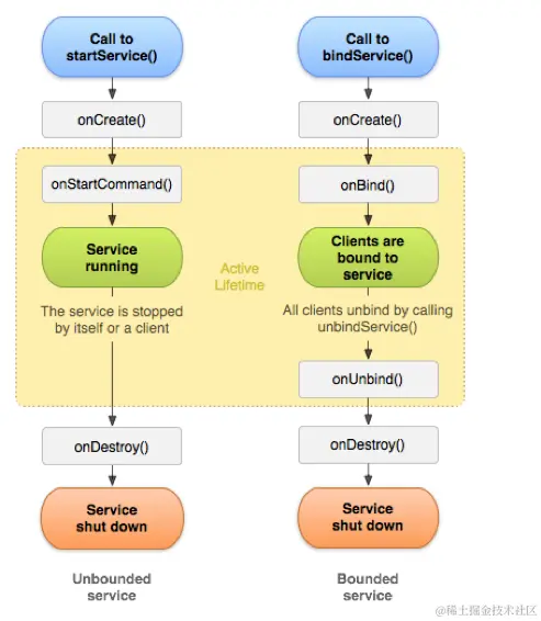 Service 作为 Android四大组件之一,应用非常广泛。和Activity一样,Service 也有一系列的生命周期回调函数,具体如下图。