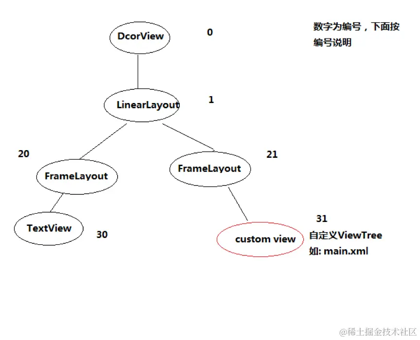 例如,有下面一个视图,DecorView为整个Window界面的最顶层View,它只有一个子元素LinearLayout。代表整个Window界面,包含通知栏、标题栏、内容显示栏三块区域。其中LinearLayout中有两个FrameLayout子元素。