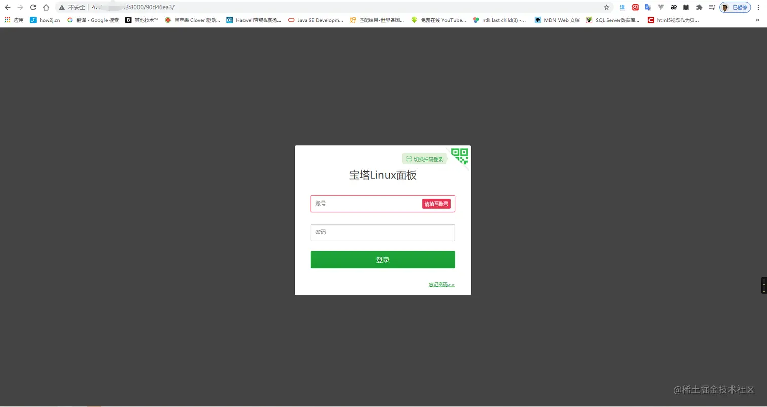 上面设置好容器端口后,就可以通过服务器ip和映射好的端口来访问创建好的宝塔面板