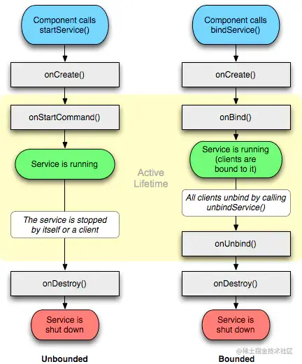 Service详解 用户376176319061 2021-01-14 163 阅读1分钟 定义: 运行在主线程的一个具备耗时操作的服务 应用场景: (1)startService()方式启动:不需要UI变化仅需要在后台运行的运行的工作,不管开启它的界面是否被销毁。可以用startService()方式启动,除非手动stopService()或者应用停止运行; (2)bindService方式启动:组件需要与Service长期连接并交互。 生命周期: 启动方式: startService():只需要一个Itent参数