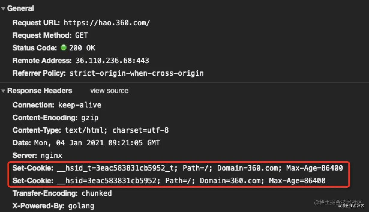 当服务端需要种cookie时,在http请求的Response Headers中添加Set-Cookie字段,浏览器接收到之后会自动解析识别,将cookie种下。