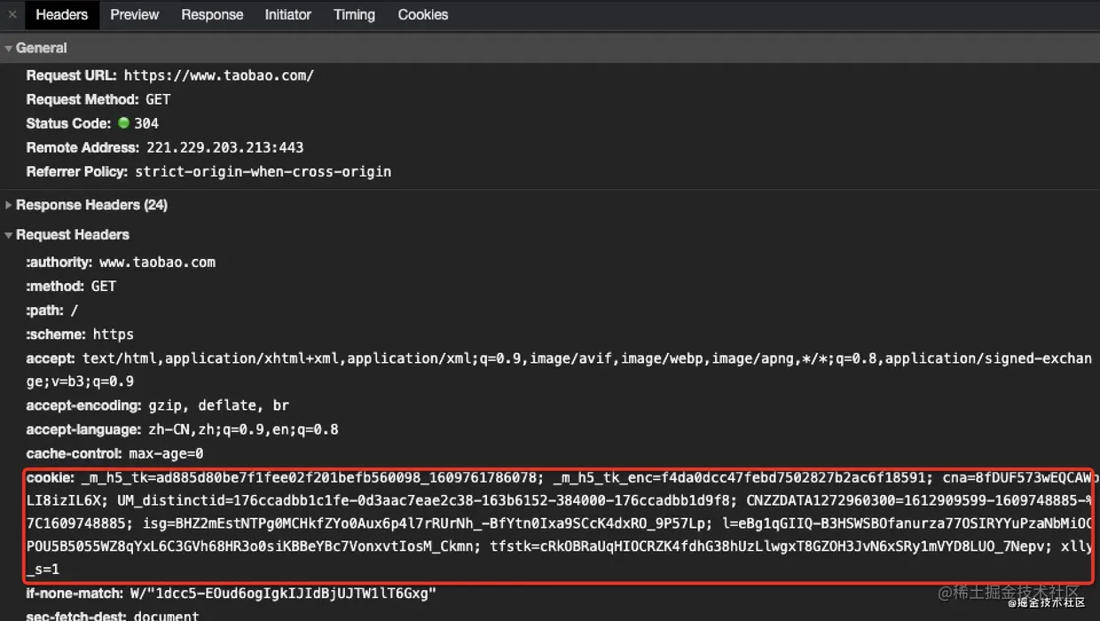 当浏览器发起一个请求时,浏览器会自动检查是否有相应的cookie,如果有则将cookie添加到Request Headers的Cookie字段中(cookie字段是很多name=value以分号分隔的字符串)。