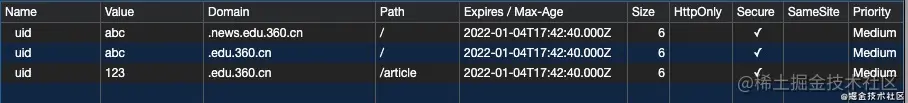 Priority:优先级,chrome的提案(firefox不支持),定义了三种优先级,Low/Medium/High,当cookie数量超出时,低优先级的cookie会被优先清除。