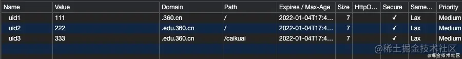 document.cookie = 'uid=123;expires=Mon Jan 04 2022 17:42:40 GMT;path=/caikuai;domain=edu.360.cn;secure;samesite=lax'
