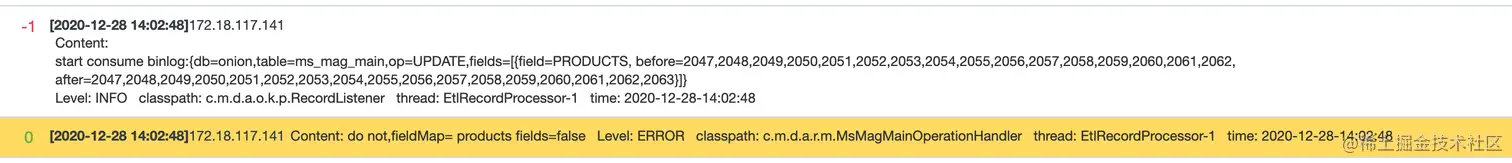 在一次调试过程中笔者发现,日记打印的Binlog显示某些字段更新之前和更新之后都有值,可是到消费的时候获取字段的值却是null,如下图所示。
