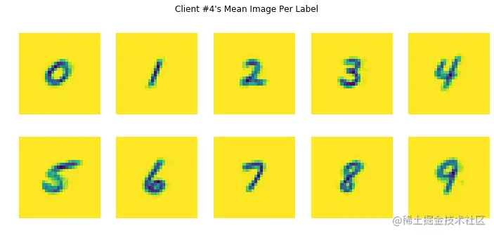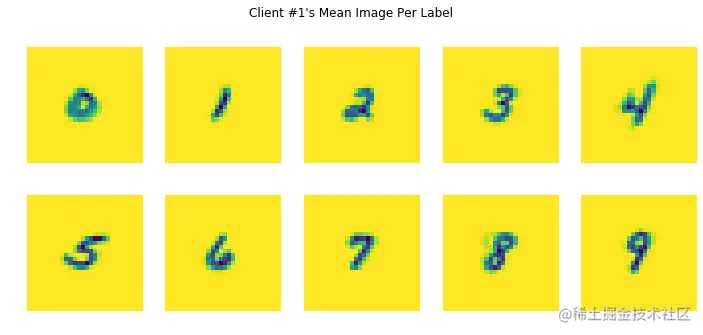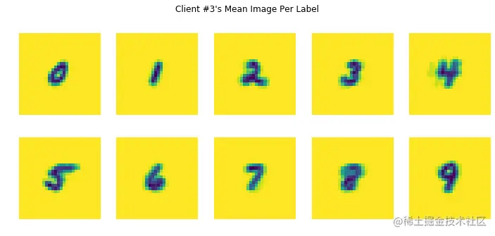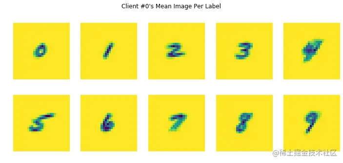现在,让我们可视化每个MNIST标签的每个客户端的平均图像。 下面的代码将为一个标签的所有用户样本生成每个像素值的平均值。 我们将看到,由于每个人独特的手写风格,就同一个数字而言,一位客户的平均图像与另一位客户的截然不同。