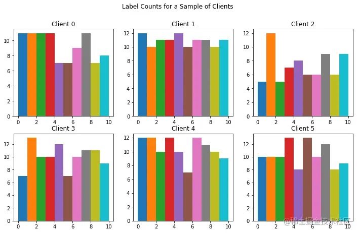 现在,我们直观地看每个客户端上每个MNIST数字标签的样本数量。 在联邦环境中,每个客户端上的样本数量可能会有所不同,具体取决于用户的行为。