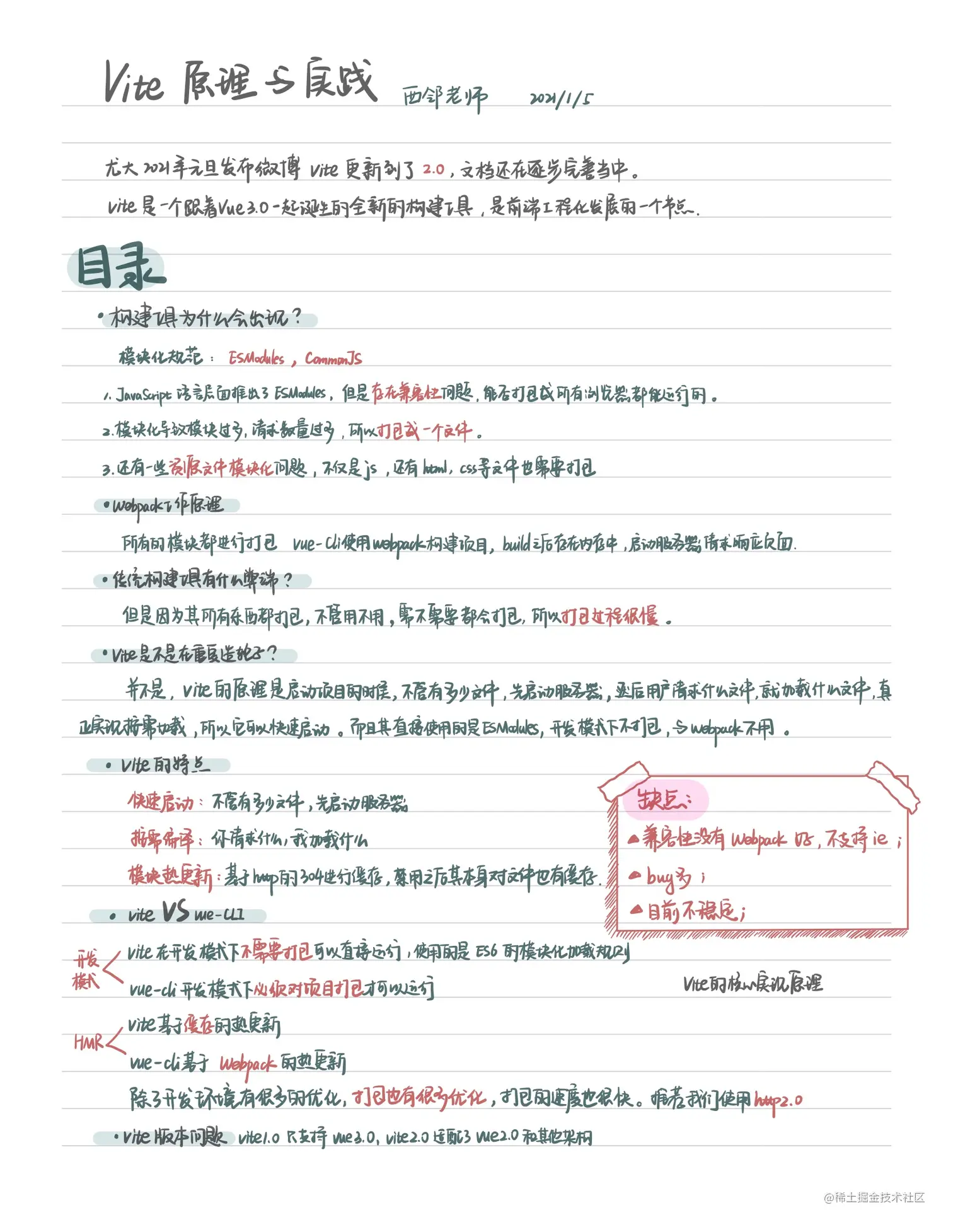 前端学习 —— Vite原理与实践直播笔记 顽皮的雪狐七七 2021-01-14 361 阅读1分钟 目录 构建工具为什么会出现? webpack工作原理? 传统构建工具有什么弊端? vite是不是在重复造轮子? vite的特点 vite VS vue-cli vite的版本问题 vite如何使用?(这个不是重点,还是需要看官方文档) 之后觉得这个标题真的估计只有原理没有实践了,因为本身直播不能记非常细节的东西。就是了解一下原理就行: