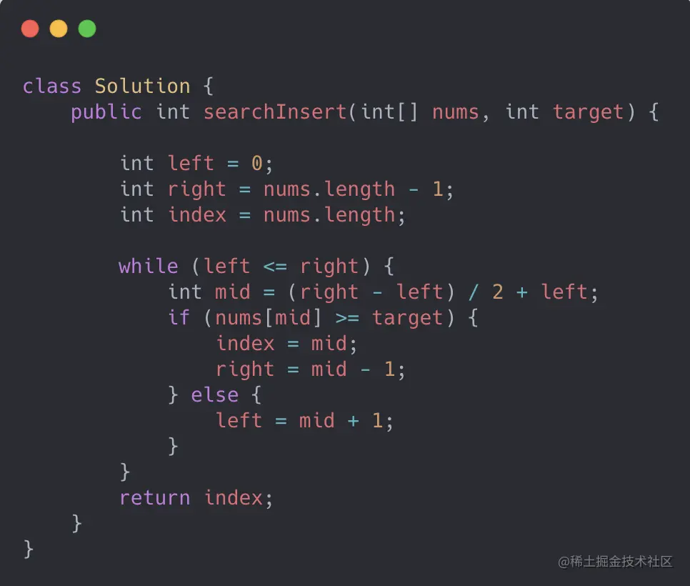 题目可以使用二分查找的方法,其实与在排序数组中找出某个元素的操作一致,只不过这道题是找出下标位置。首先取出数组的头、尾及中间元素的下标,比较中间元素与目标值的大小。