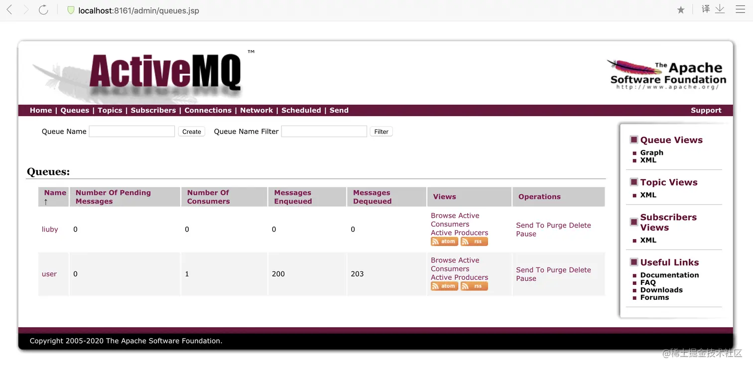 可以看出测试成功了,消费者把消息队列的数据取了出来。 然后我们可以从网页上查看Queues的信息