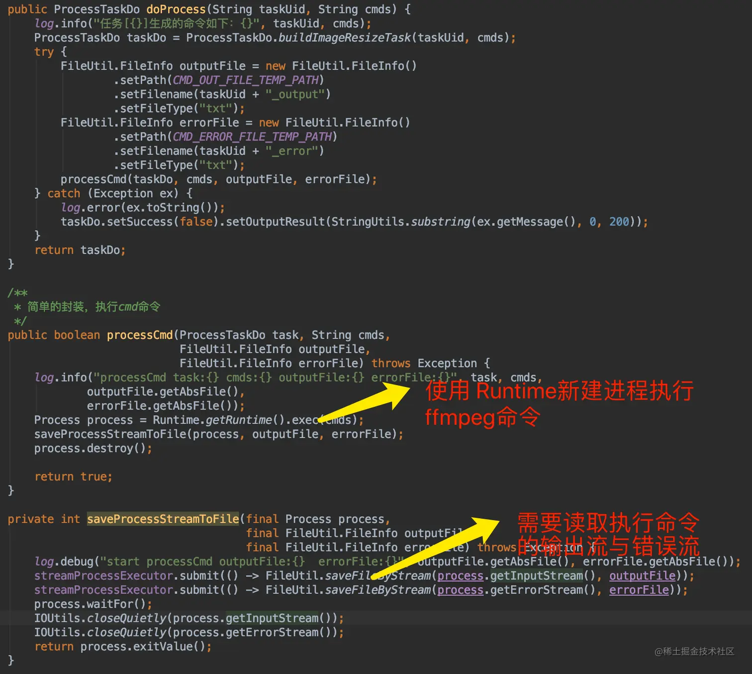 这里使用了jdk中Runtime类,里面可以使用Process新建进程来执行ffmpeg命令,其中需要读取执行命令的输出流与错误流。特别注意:我们在这里踩到了进程间通信和不同进程在容器实例的内存分配问题两个大坑。