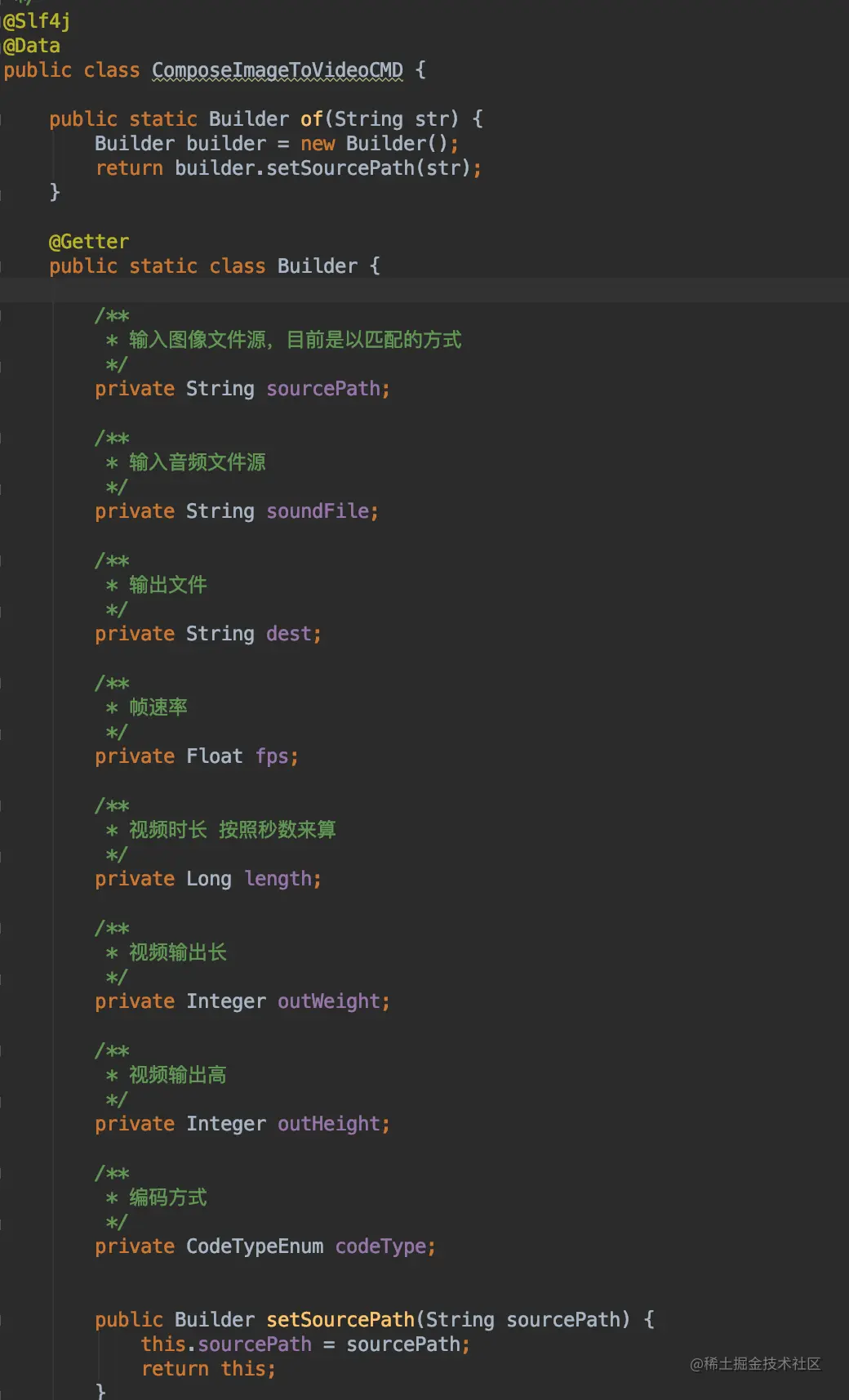 ffmpeg使用起来会比较复杂,主要是因为它的输入参数太多了,这里使用建造者模式将整个命令组装过程给封装起来,方便使用者快速明白参数含义。