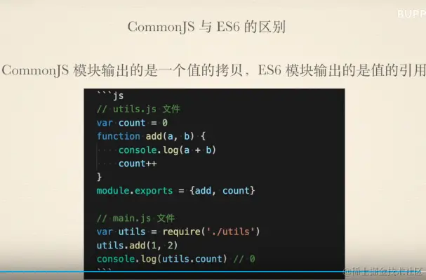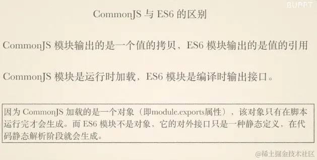 ES Module不支持动态导入,但已提案,指日可待。 ES Module是异步导入,因为用于浏览器,需要下载文件,如果采用同步导入对渲染有很大影响。CommonJS是同步导入,因为用于服务端,文件都在本地,同步导入即使卡主主线程影响也不大。 ES Module导出的是值的引用,导入导出值都指向同一个内存地址,所以导入值会跟随导出值变化。而CommonJS在导出时都是值的拷贝,就算导出的值变了,导入的值也不会改变,所以想要更新值,必须重新导入一次。