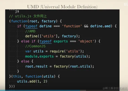 如果你在js文件的头部看到这样的代码,这个js文件使用的规范就是UMD规范;