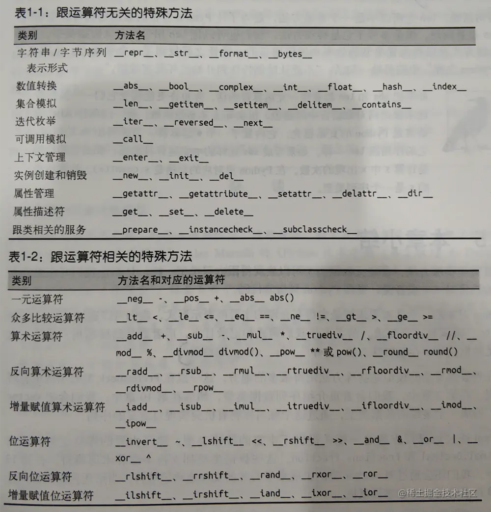collection.len()是面向对象语言的写法,len(collection)是Python语言的写法,这种风格叫做Pythonic。从前者到后者,就像变魔术一样,一瞬间让人眼前一亮。这个魔术就是Python魔法方法,或者叫双下方法,它是用双下划线开头和双下划线结尾的特殊方法,比如obj[key],Python解释器实际上会转换成obj.__getitem__(key)来运行,但是使用者并无感知。