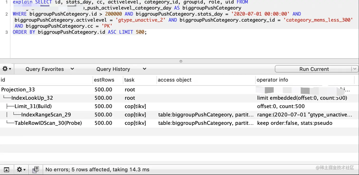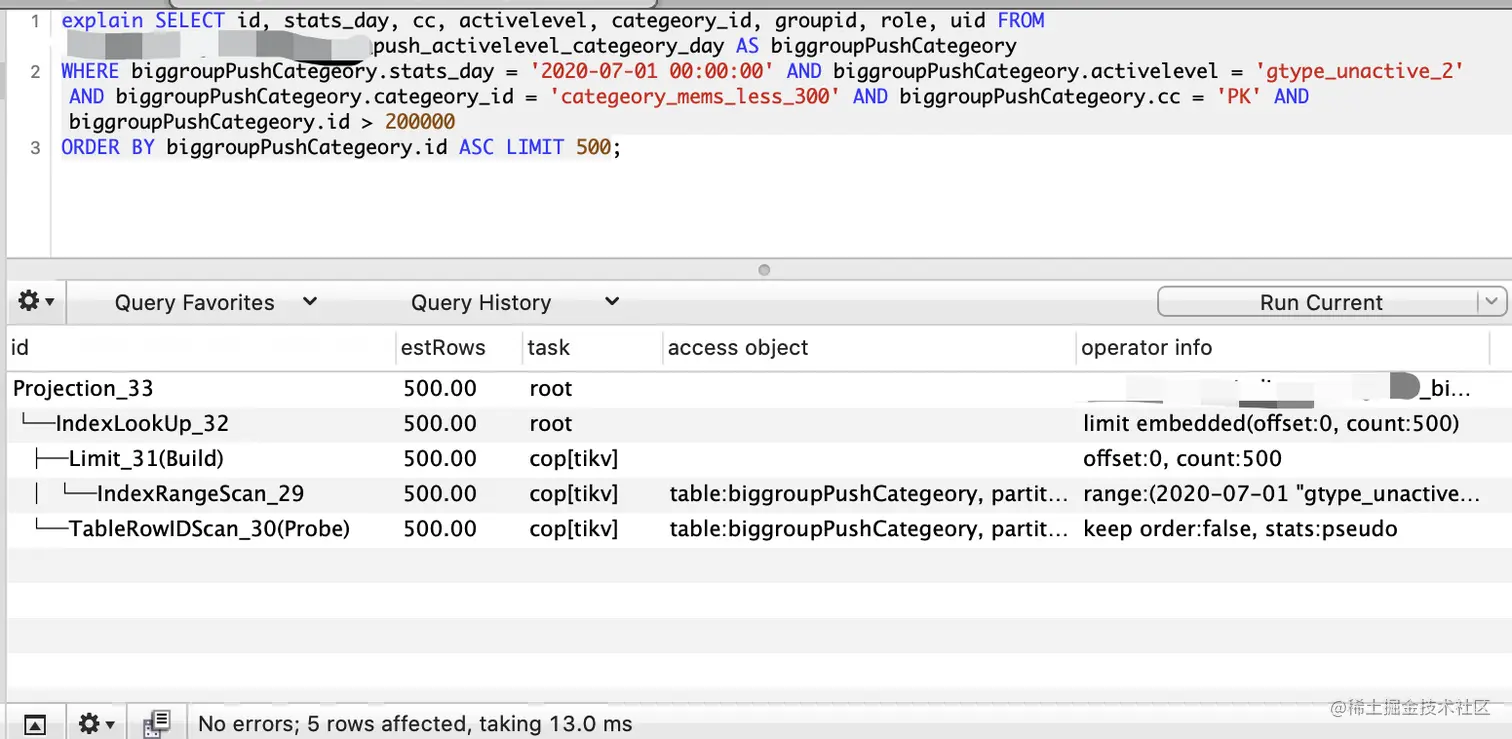 sacci(stats_day,activelevel,categeory_id,cc,id),当我们进行索引查询取500行时,可以根据id>20000,直接命中500行并返回,不需要重新排序,也不会返回之前sacc索引的所有结果集 - 以下是优化前和优化后的对比图,性能提高了几十倍