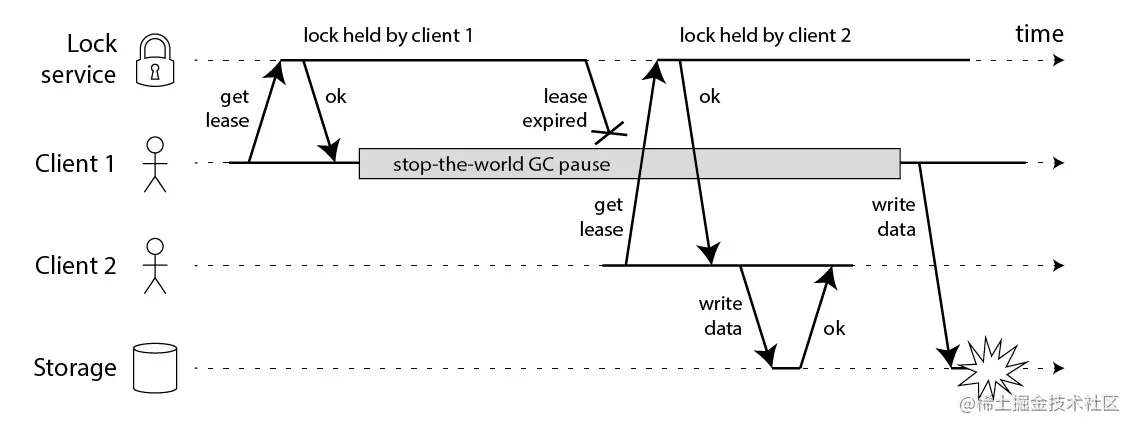 这样,客户端1和客户端2就同时拿到了锁,程序安全的隐患依然存在。除此之外,如果这些节点里面某个节点发生了时间漂移的话,也有可能导致锁的安全问题。