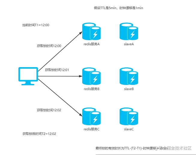 比如TTL是5s,连接redis获取所有锁用了2s,然后再减去时钟漂移(假设误差是1s左右),那么锁的真正有效时长就只有2s了;