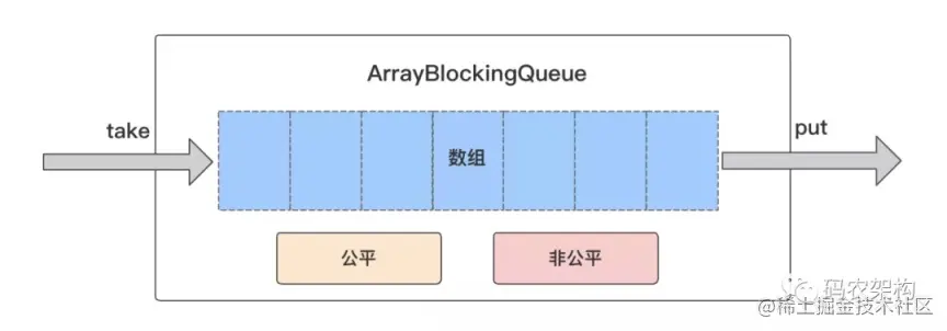 从名字可以看出它的存储结构就是一个数组,即基于数组实现了一个FIFO的阻塞队列。新元素都插入到队列尾部,于是最先进入的元素在队列头而最后进入的元素在队列尾部。该数组是有界的,所以构造时需要制定数组的大小。此外,该阻塞队列还提供公平和非公平两种模式。